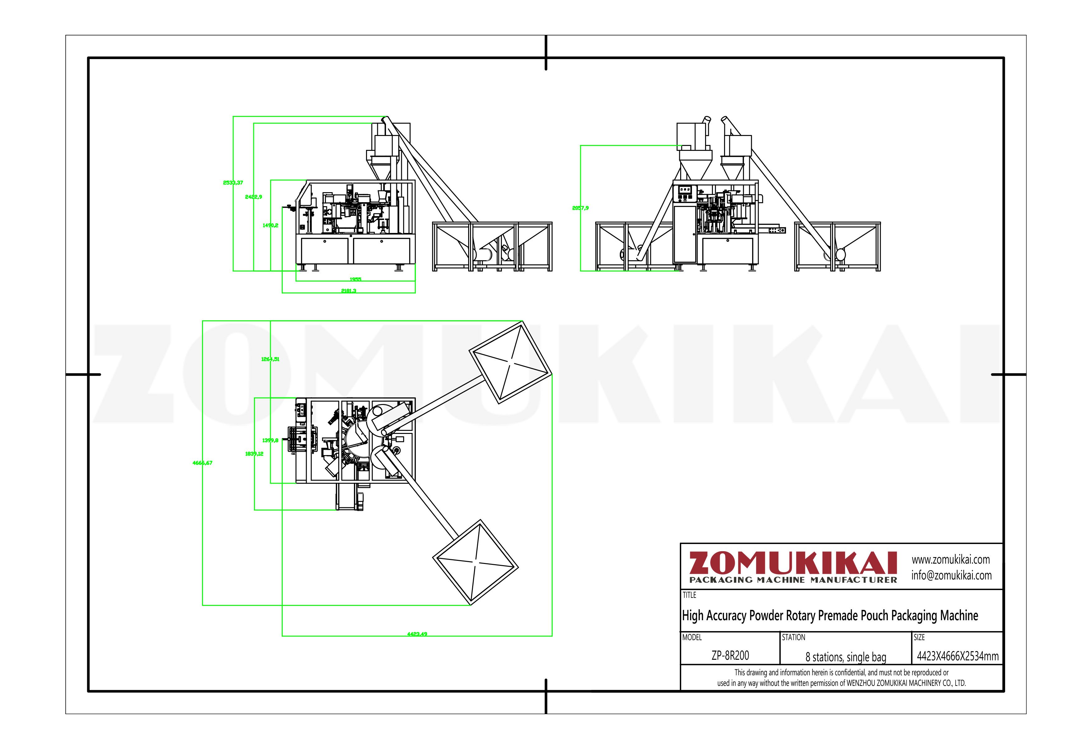 Lukisan CAD Mesin Pembungkus Kantung Prabuatan Serbuk Ketepatan Tinggi ZP-8R200 menunjukkan struktur dan dimensinya. Mesin ini sesuai untuk membungkus serbuk campuran atau berat besar, seperti tepung, serbuk protein, susu tepung, dan bahan binaan. Ia mempunyai sistem penimbang dwi-skru untuk pengukuran yang tepat, memastikan pembungkusan yang konsisten dan tepat.